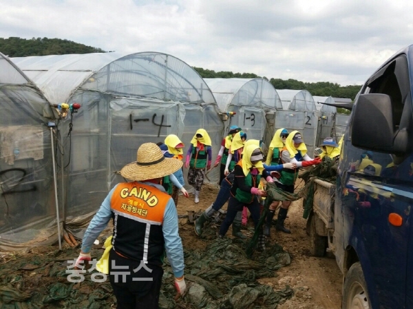 이날 복구작업에는 계룡시자율방재단 단원 30여명이 참여한 가운데, 지난 16일 기록적인 폭우로 피해를 입은 비닐하우스 재배 농가를 찾아 시설 내부에 쌓인 오물과 진흙을 제거하는 등 현장 복구에 힘을 보탰다.