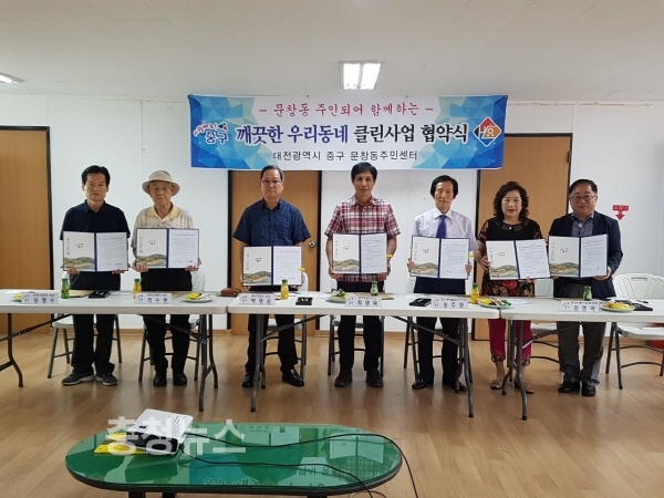 문창동 주민센터(동장 이승복)는 27일 주민센터에서 문창 1·2경로당, 문석경로당 등 3개 경로당과 문창신협이사장, 문창전통시장상인회장, 문창초등학교장, 창신새마을금고이사장 등 7개 단체가 참석해 깨끗한 마을을 만들기 위한 협약을 맺었다.
