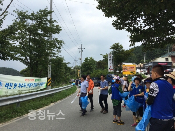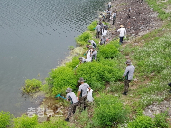 이날 주민과 사회단체, 군부대, 공무원 등 1000여 명은 지난 폭우로 하천 및 저수지로 유입된 쓰레기 45톤을 수거했다.