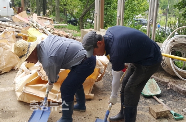 28일 충남도의회 김응규 의원과 아산시의회 심상복 부의장, 유명근, 이영해 의원은 천안 흑성산 산사태로 피해를 입은 국학원 한민족역사공원에서 수해복구 지원에 구슬땀을 흘렸다.