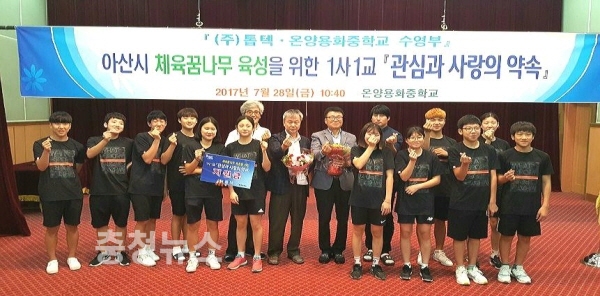 홍권표 온양용화중 교장은 “(주)톱텍을 비롯한 많은 분들의 응원과 격려에 감사드린다. 앞으로 어린선수들이 자신의 성장과 꿈을 이룰 수 있도록 열심히 뒷받침 하겠다”고 말했다.