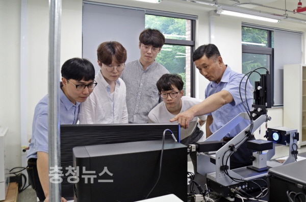 한관영 교수(오른쪽 끝)가 제자들과 표면에너지측정장치 실험을 하고 있다 /사진제공 단국대
