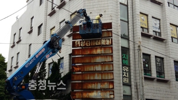 대전 동구(구청장 한현택)는 여름철 풍수해로 인해 안전사고 위험이 있는 장기간 방치 노후간판에 대해 오는 4일까지 일제정비에 나선다.