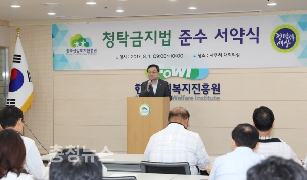 산림청 한국산림복지진흥원(원장 윤영균)은 1일 대전 서구 둔산동 진흥원 대회의실에서 윤영균 원장을 비롯한 전직원이 참석한 가운데 ‘부정청탁 및 금품 등 수수의 금지에 관한 법률 준수 서약식’을 가졌다고 밝혔다.