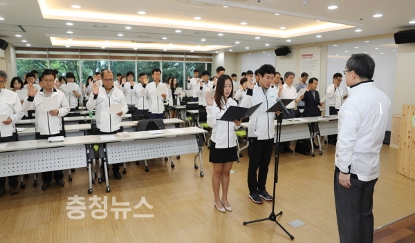 한국산림복지진흥원이 1일 대전 서구 둔산동 진흥원 대회의실에서 열린 청탁금지법 준수 서약식에서 직원들이 선서를 하고 있다.