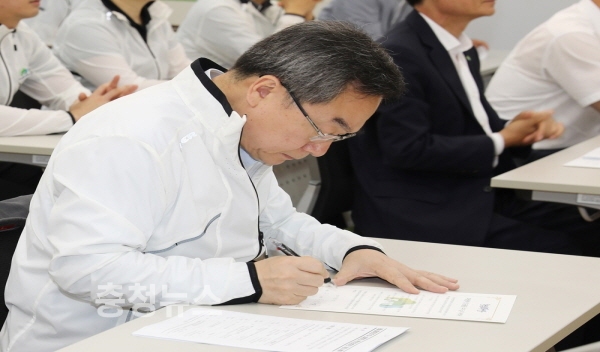 윤영균 한국산림복지진흥원장이 1일 대전 서구 둔산동 진흥원 대회의실에서 열린 청탁금지법 준수 서약식에서 서약을 하고 있다
