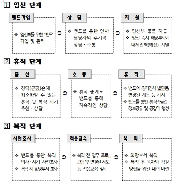 인사케어 프로그램은 SNS ‘밴드’를 통해 운영하게 되며, 임신단계, 휴직단계, 복직단계별로 인사 관련 상담·소통·지원을 하게 된다.
