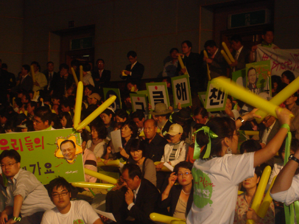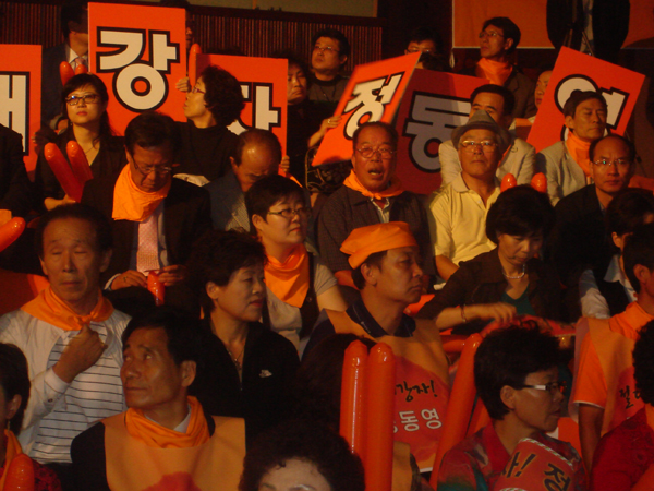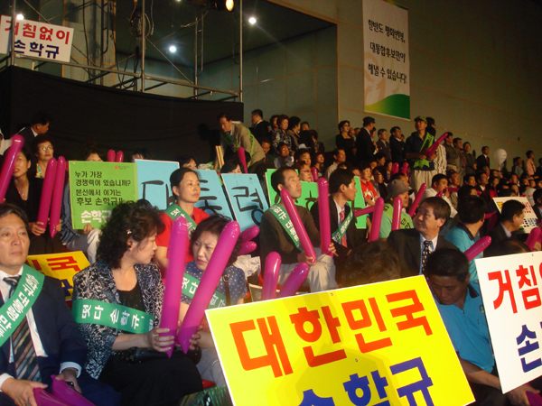 대전 배재대21세기관에서 열린 대전충남지역 대통합민주신당 국민경선 합동연설회에서 이날 후보자들은 노무현 대통령의 내일 방북을 집중 거론하며 자신만이 냉전 종식과 차기 정부를 이끌어갈 적임자임을 내세웠다.