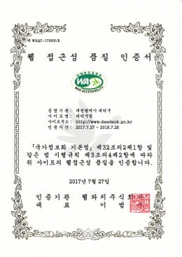 대전 대덕구(구청장 박수범)는 과학기술정보통신부(전 미래창조과학부) 지정 국가 공인 인증기관인 웹와치주식회사로부터 ‘웹 접근성 품질 인증 마크’를 획득했다.