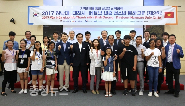 2일 한남대를 방문한 베트남 빈증성 학생들과 한남대 관계자들이 문화교류를 마치고 기념사진을 촬영하고 있다. /사진제공 한남대
