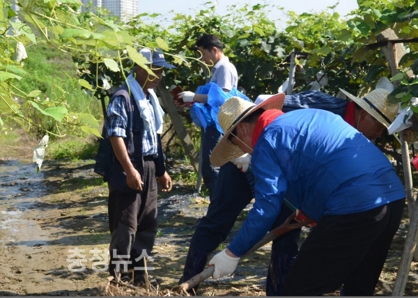 아산시의회(의장 오안영) 의원과 의회사무국 직원들 30여명이 2일 7월 집중호우에 의한 침수로 피해를 입은 탕정면 수해농가(갈산리 640번지 일원) 포도밭에서 아침부터 오후까지 수해복구에 구슬땀을 흘렸다.