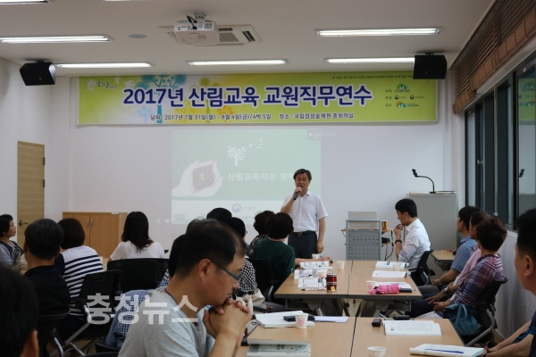 '2017 산림교육 교원 직무연수'가 개최되고 있는 국립장성숲체원에서 3일 박산우 장성숲체원장이 광주전남지역 초.중.고등학교 교원들을 대상으로 인사말을 하고 있다 /한국산림복지진흥원 제공