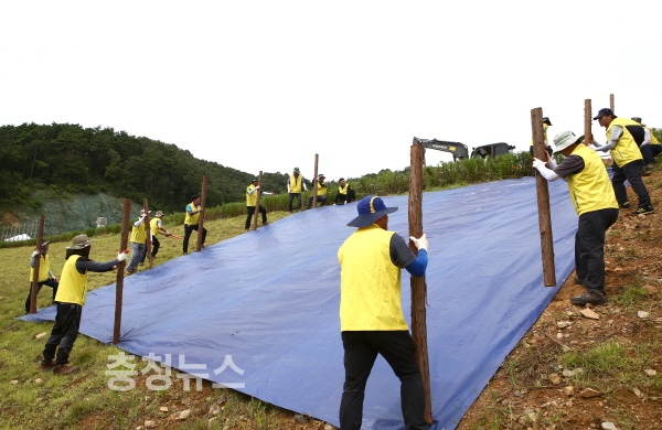 공사 현장의 안전사고 대책도 추진 중이다. 특히 절개지나 급경사지와 같이 토사가 무너질 위험이 있는 곳에 빗물이 스며들지 않게 방수포를 설치한다.
