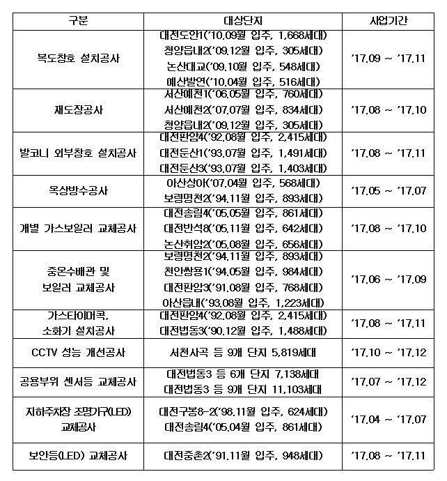 ※ 2017년 대전충남지역 노후 임대주택 시설개선사업 추진일정(LH)