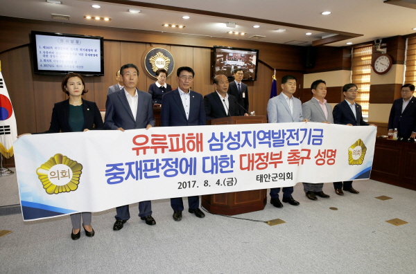 태안군의회(의장 이용희)는 지난 4일, 제246회 임시회 본회의에서 유류피해 삼성지역발전기금 배분 중재판정에 대한 성명서를 채택했다.