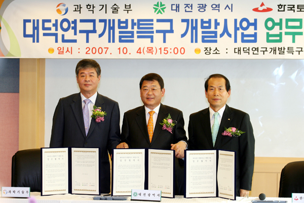 박성효 대전시장은 4일 오후 3시 대덕특구지원본부에서 과학기술부 정윤 차관, 대덕특구개발 사업시행자인 한국토지공사 윤석종 부사장과 함께 ‘대덕특구 개발사업에 관한 업무협약’을 체결하고 1, 2단계 산업용지 조기개발에 착수키로 했다.