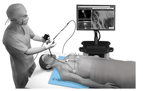 ENB 시술 장면. 환자 몸에 부착된 센서와 로케이션 보드, 영상 장비 등을 통해 카테터와 병소의 위치, 병변으로의 정확한 접근 여부 등을 시술의가 확인할 수 있다.