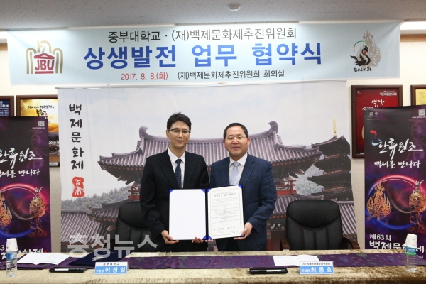 중부대학교(총장 홍승용)는 8일 백제문화제추진위원회와 제63회 백제문화제 성공 개최와 지역인재 양성을 위한 업무협약을 체결했다고 밝혔다.