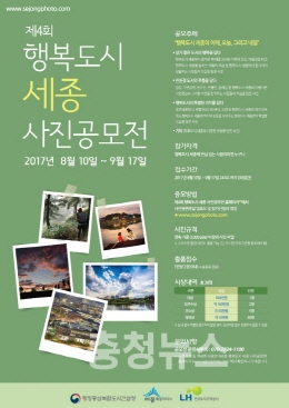 세종시(시장 이춘희)는 행정중심복합도시건설청(청장 이원재), 한국토지주택공사 세종특별본부(본부장 조성순)와 공동으로 「제4회 행복도시 세종 사진공모전」을 개최한다고 9일 밝혔다.