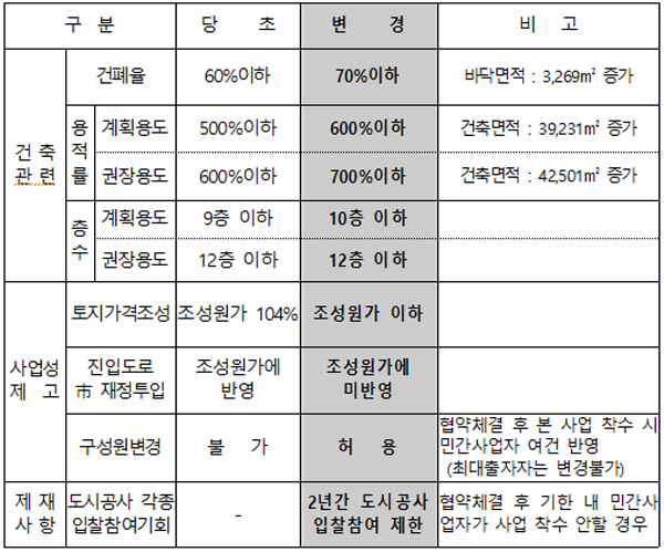 책임성있는 사업추진을 위해 민간사업자가 협약체결 후 기한내에 사업착수를 안할 경우 2년간 도시공사 사업에 입찰참여를 제한하는 조건도 추가했다.