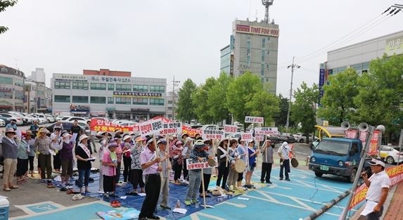 논산시 연무읍 기산아파트 피해대책위와 주민 60여명이 8일 시청 앞에 모여 A아파트 공사 중단 ’촉구 집회를 개최하고, 안전대책 마련 등 요구사항 관철 시까지 총궐기하겠다고 밝혔다.