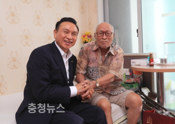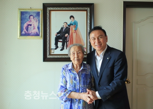 구본영 천안시장이 10일 천안시 쌍용동에 거주하는 100세 이상 어르신을 방문해 안부를 살피고 있다