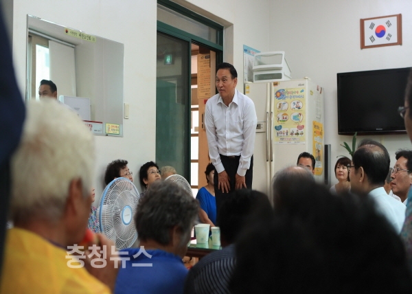 구본영 천안시장이 10일 직산읍 소재 삼은13리 경로당을 찾아 어르신들에게 건강한 여름나기를 당부하고 있다
