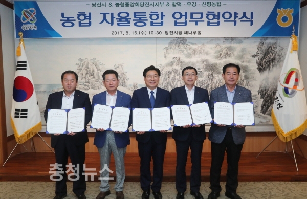 충남 당진시에 따르면 16일 당진시청 해나루홀에서 시와 농협중앙회당진시지부, 합덕․우강․신평농협이 농협자율통합에 관한 업무협약을 체결했다.