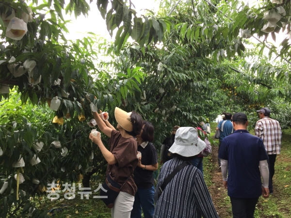 이날 참가자들은 연서면 서당골 농원에서 복숭아 수확체험, 복숭아식초만들기 등을 진행했다.