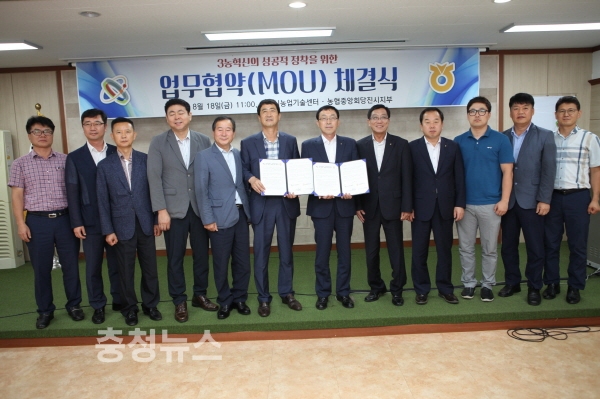 센터에 따르면 18일 센터와 당진시지부는 센터 회의실에서 양측 관계자 등 10여 명이 참석한 가운데 연구개발 기술공유와 농가소득 증대 등을 주요 골자로 한 상호협력 및 교류에 관한 업무협약을 체결했다.