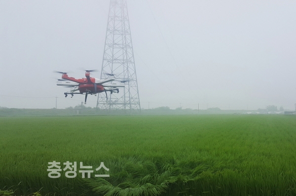 충남 예산군농업기술센터가 드론을 이용한 병해충 방제를 실시하며 주요 해충 발생에 신속 대처하고 피해를 최소화하고 있다.