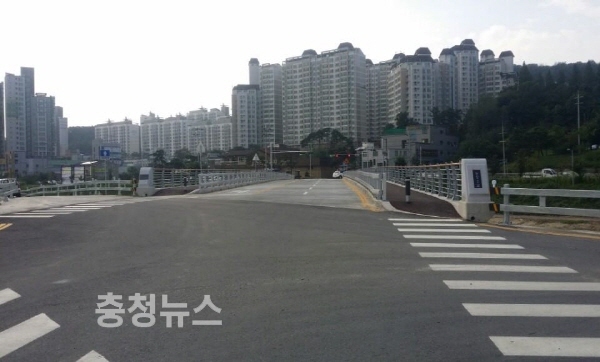 시는 지난해 9월 45억원(국비5, 도비5, 시비35)을 투입, 착공에 들어가 총연장 90.4m, 도로폭 15.3m 규모로 교량을 건설하고 설치공사를 성공적으로 마무리했다.