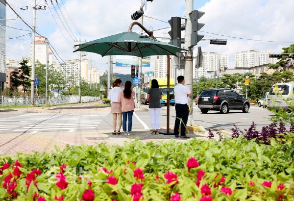 충남 서산시가 횡단보도에서 보행자들이 잠시 더위를 식힐 수 있도록 공간을 마련해 시민들의 가려운 곳을 긁어 주는 배려의 행정을 펼쳤다는 평이다.