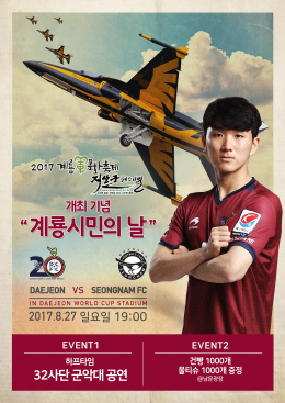 시는 오는 27일 대전시티즌 홈경기를 ‘계룡시의 날’로 지정하고, 대전 월드컵경기장을 찾아 시의 주요행사 및 축제를 전국의 관람객과 시청자들에게 적극 홍보한다고 밝혔다.