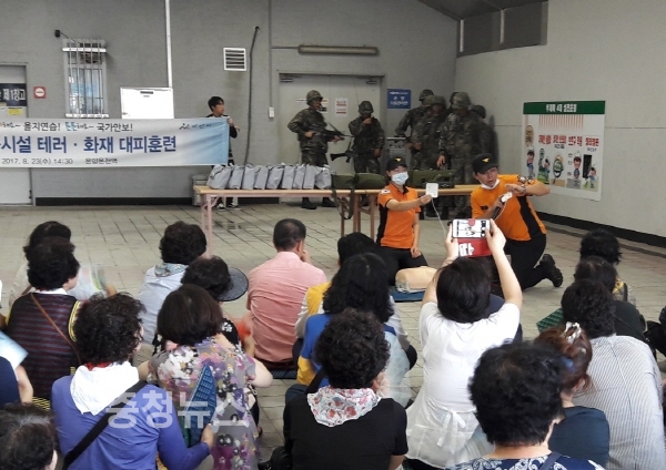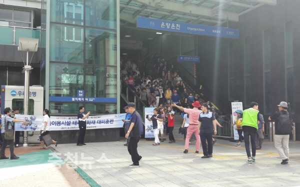 또한 이어서 을지연습 실제훈련으로 다중이용시설 테러·화재대피훈련을 온양온천역에서 민·관·군·경 합동으로 실시했다.