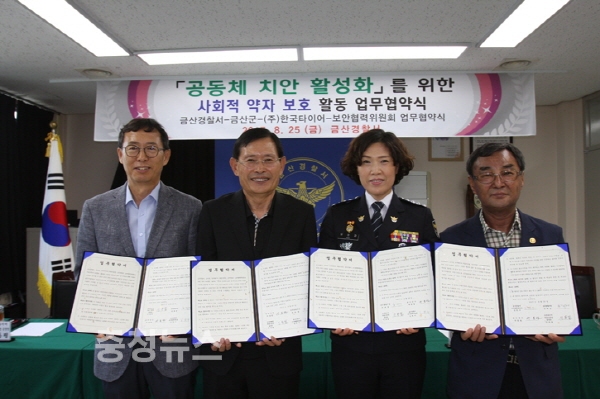 한국타이어(대표이사 서승화)가 25일 충남 금산군 금산경찰서에서 한국타이어 신동필 금산공장장, 박동철 금산군수, 금산경찰서 유희정 서장, 보안협력위원회 김영수 위원장 등이 참석한 가운데 사회취약계층의 복지증진과 정착 지원을 위한 업무협약을 체결했다.