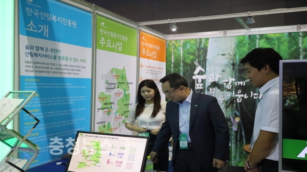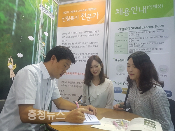 이날 김재현 산림청장과 윤영균 한국산림복지진흥원장은 진흥원 채용부스를 돌아보며 참가자들을 격려하였다.