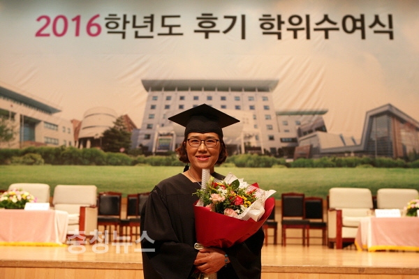 이경애 씨는 올해 56세의 만학도로 인문사회대학 졸업생을 대표해 성적우수상(총장상)을 받았다. 이 씨는 “배움에 있어서 나 자신에게 후회가 남지 않도록 늘 최선을 다해 공부했다.”고 밝히고, “젊은 친구들과 경쟁하는 것이 쉽지 않았고, 개인적인 어려움도 있었지만 학과 교수님들의 격려와 학우들의 도움으로 졸업을 하고 성적우수상도 받게 됐다.”며 감사의 마음을 전했다.
