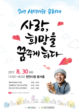 충남 천안시는 오는 9월 10일 ‘세계 자살예방의 날’을 기념하기 위해 30일 시청 봉서홀에서 ‘2017년 생명사랑 문화제’를 개최한다고 밝혔다.