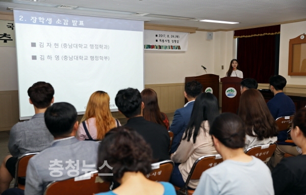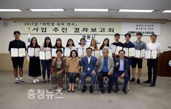 (재)계룡시애향장학회(이사장 최홍묵)가 지난 24일 시청 상황실에서 2017년 대학생 국외 연수 사업 추진 결과보고회를 개최했다.