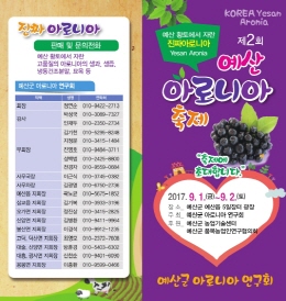 아로니아 연구회(회장 정연순)가 주관하는 이번 축제는 군민, 도시민 소비자, 품목농업인연구회원, 예산군농업인단체, (사)한국 아로니아 협회원 등 1500여 명이 참여할 예정으로 지역에서 생산된 아로니아에 대한 소비자 인지도 제고 및 판로를 확보하고 아로니아를 홍보해 농가소득을 향상하고자 마련됐다.
