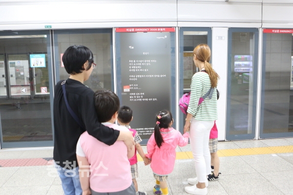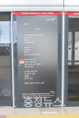대전도시철도공사(사장 김민기)는 대전 지역문인의 시 44편을 22개역 승강장안전문(스크린도어) 88개소에 부착했다.
