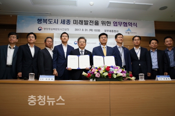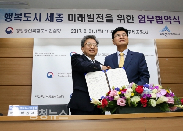 행정중심복합도시건설청(청장 이원재)과 세종특별자치시(시장 이춘희)는 국가균형발전 정책목적을 달성하고 명실상부한 행정중심복합도시 세종을 완성하기 위해 31일 상호 업무협약을 체결, 도시건설 관련 사무를 조정하기로 합의했다.
