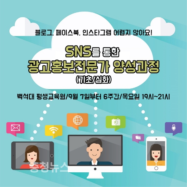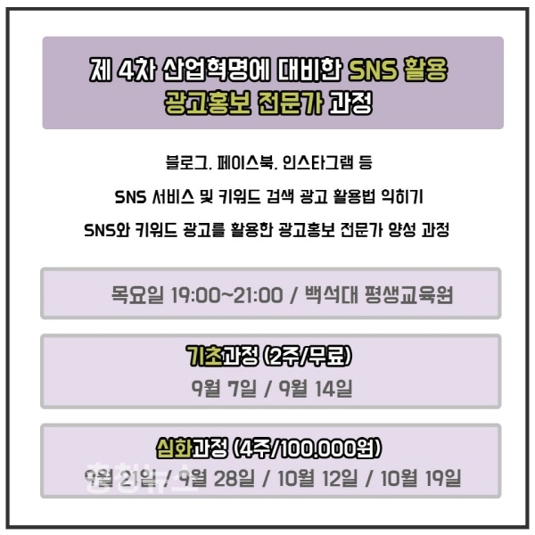 백석대학교(총장 장종현) 평생교육원은 이달 7일부터 오는 10월 19일 총 6주간 교내 자유관 605호에서 ‘SNS활용광고홍보전문가’ 양성과정을 진행한다.