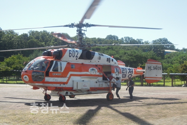 산림청 헬기 항공예찰 및 예찰을 위해 담당자가 탑승하는 모습