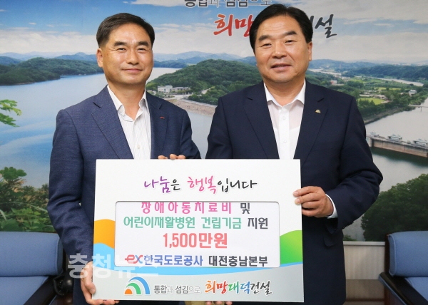 대덕구 송촌동에 위치한 한국도로공사 대전충남본부(본부장 권오철)에서는 5일 구민의 사랑방에서 장애아동 치료비 1000만원과 어린이재활병원 설립기금 500만원을 대덕구(구청장 박수범)에 기탁했다.