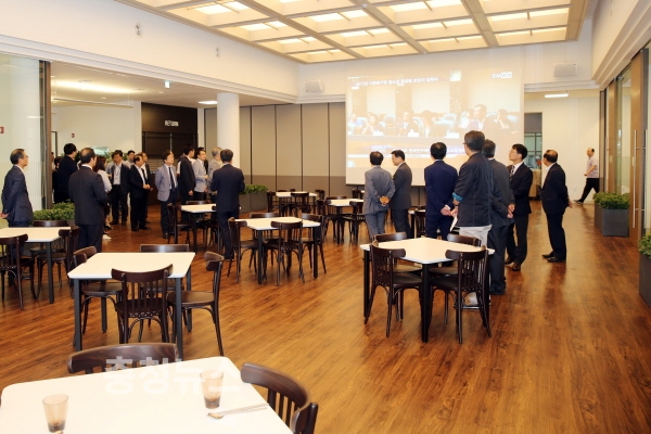 선문대학교(총장 황선조)는 지난 4일 성화학숙(기숙사) 친교관에서 황선조 총장, 박정훈 총학생회장을 비롯한 교직원, 학생, 기업관계자 등 200여 명이 참석한 가운데 ‘친교관 선문 마을공동체 RC라운지 구축공사’ 준공식을 개최했다.