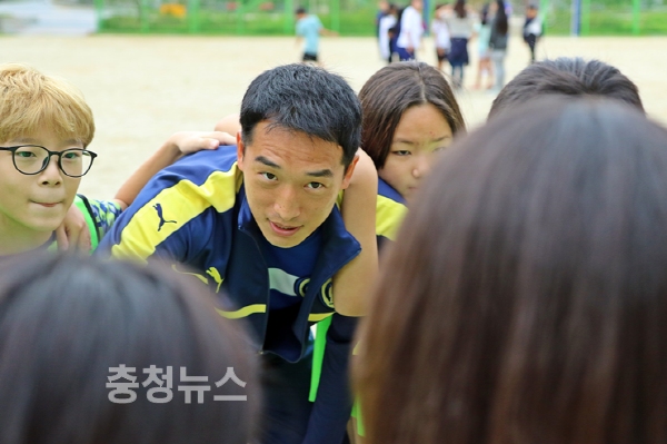 아산무궁화프로축구단 선수들이 아산초등학교 학생들과 함께 축구를 하며 즐거운 시간을 보냈다.