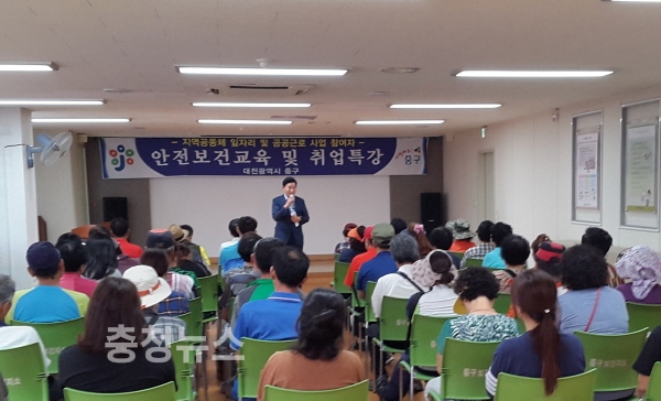 대전 중구(구청장 박용갑)는 7일 지역공동체일자리 및 공공근로 사업 참여자와 사업담당자 71명을 대상으로 안전교육을 실시했다.