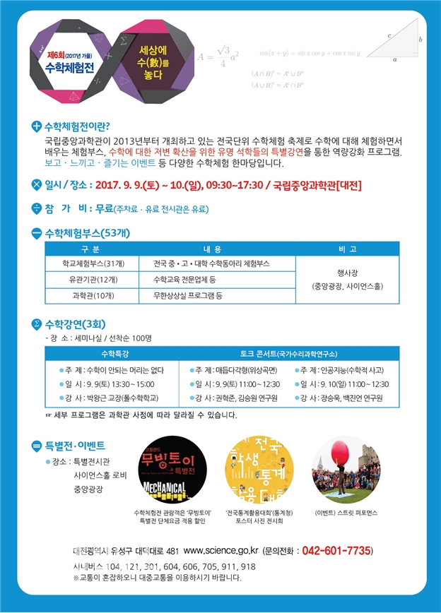 주요 프로그램은 수학을 체험하면서 즐기는 수학 체험부스, 수학분야 전문가에게 듣는 수학강연, KAIST 학생들의 이공계 진로멘토링 등 다양한 이벤트로 구성‧운영된다.